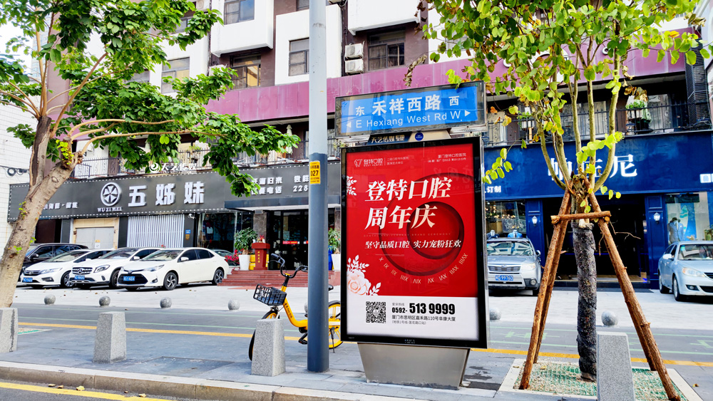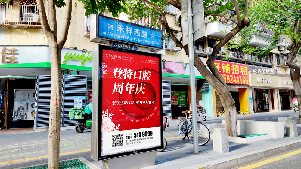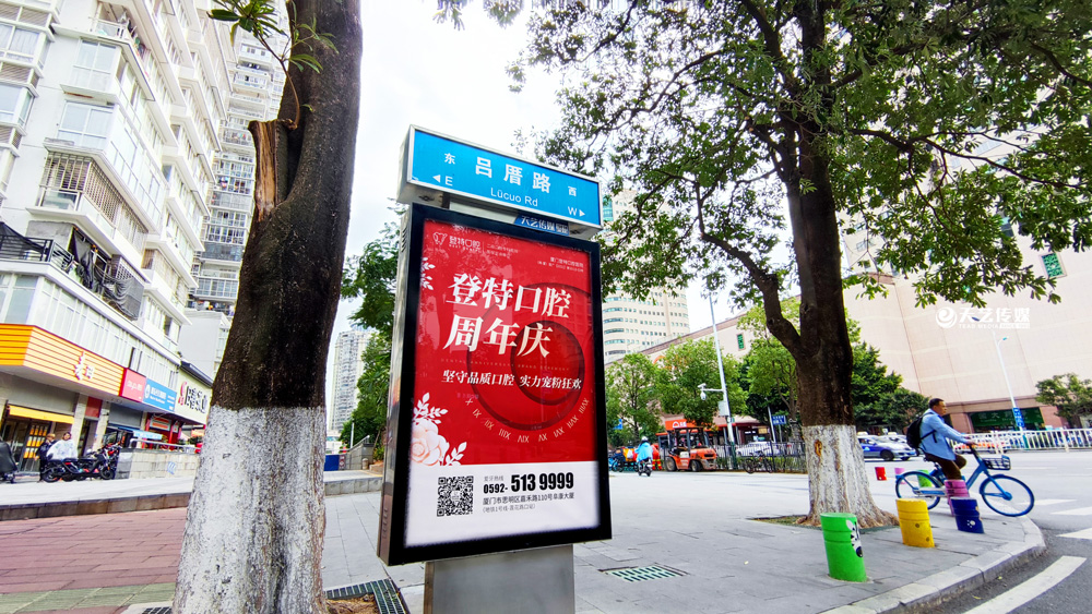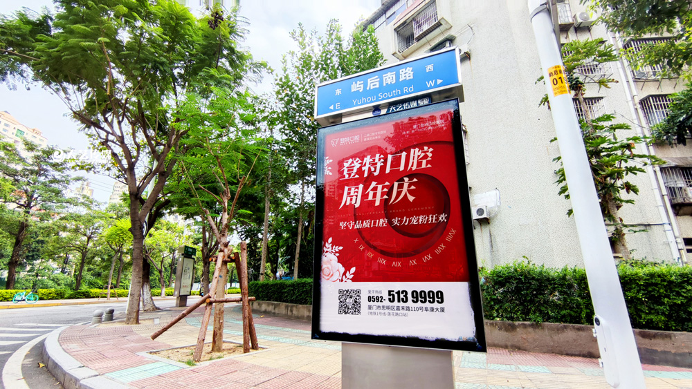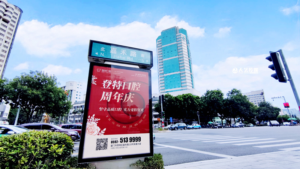 同時,廈門登特口腔繼續(xù)與廈門天藝傳媒合作,投放鷺島全城超200座城市路名牌,覆蓋島內(nèi)各大交通主干道(如嘉禾路、禾祥西路、禾祥東路)、核心商圈、商務(wù)區(qū)寫字樓林立區(qū)、人流車流覆蓋密集區(qū)域。