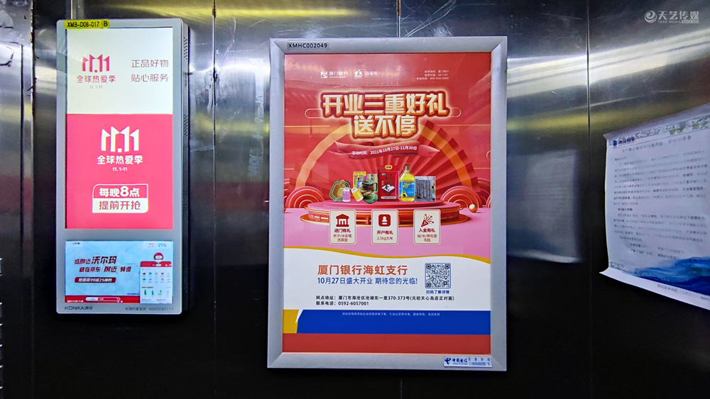 此次廈門(mén)銀行海虹支行選擇與天藝傳媒進(jìn)行戶(hù)外媒體投放的合作,投放海滄區(qū)(以海滄的生活區(qū)、海虹支行周邊區(qū)域?yàn)橹?的多個(gè)戶(hù)外廣告媒體,包括公交候車(chē)亭媒體、電梯框架廣告、社區(qū)公告欄媒體及社區(qū)出入口的道閘媒體等。