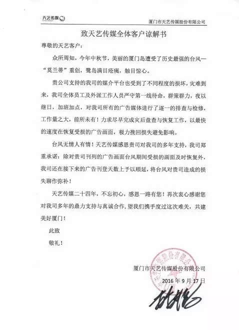 臺風(fēng)無情人有情!天藝傳媒感恩貴司對我司的多年支持,我司鄭重承諾:除對貴司刊列的廣告畫面臺風(fēng)期間受損的畫面及時恢復(fù)外,我司還在接下來的廣告刊登天數(shù)上予以順延,將臺風(fēng)對貴司造成的損失聊作彌補!